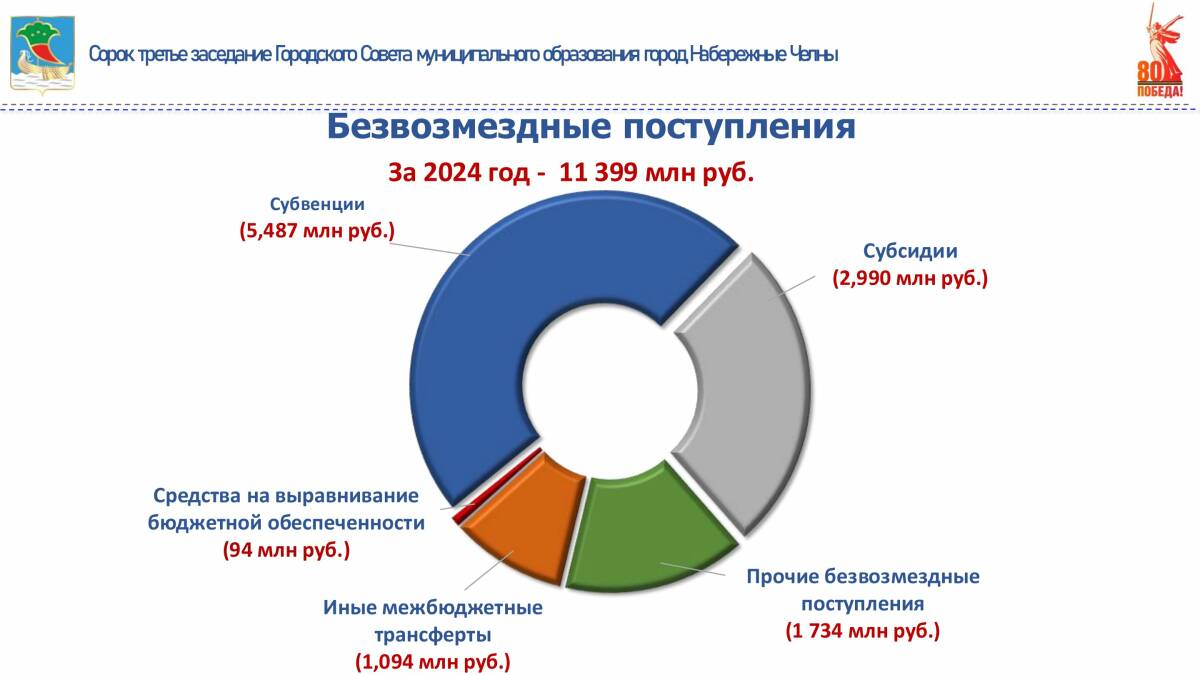 Безвозмездные поступления увеличились на 2,25 млрд рублей и достигли 11,4 млрд рублей. Основная часть — субвенции (48%) и субсидии (26%).