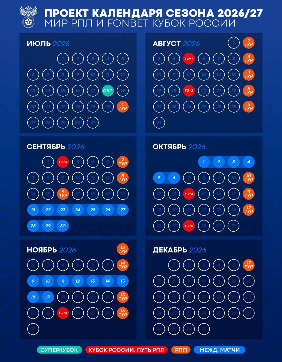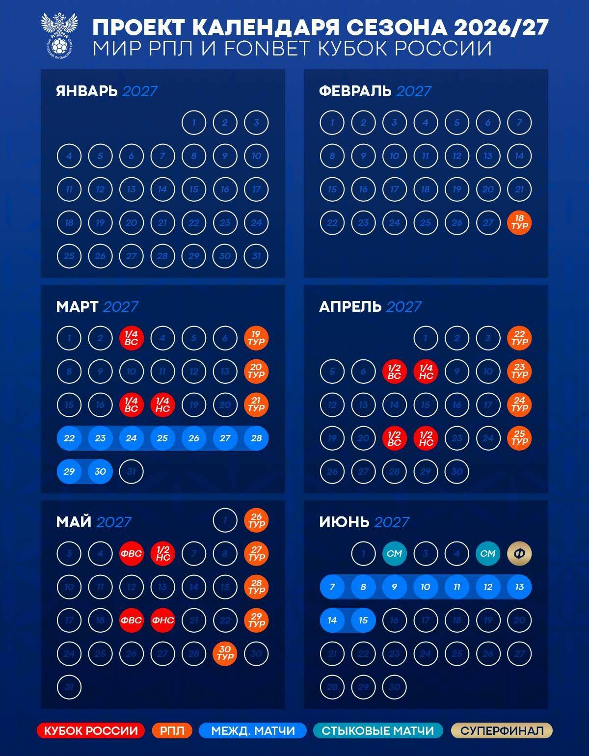 Новый сезон откроется матчем за Суперкубок России, который состоится 18 июля 2026 года. Старт Мир Российской Премьер-Лиги запланирован на 26 июля. Финальный матч Фонбет Кубка России (Суперфинал) пройдет 6 июня 2027 года.