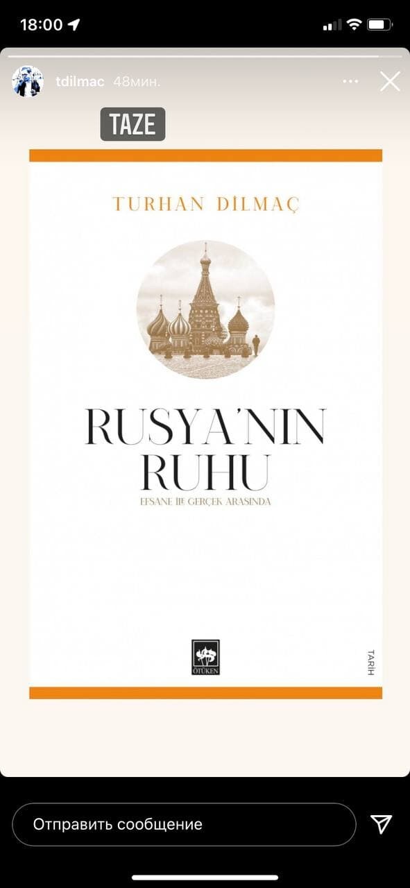 Сегодня в Турции вышла в свет книга «Rusya’nin ruhu. Efsane ile gercek arasinda» («Душа России. Между мифами и реальностью»), написанная турецким дипломатом Турханом Дильмачем. О выходе книги автор сообщил в своем Instagram.