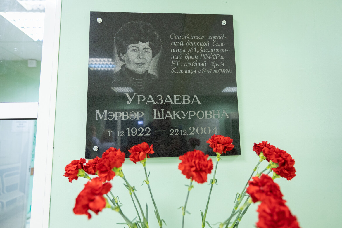 В Первой детской больнице Казани открыли мемориальную доску первому главному врачу клиники Уразаевой Мэрвэр Шакуровне. 11 декабря этого года ей исполняется сто лет. В честь ее дня рождения совет ветеранов ГДБ №1 и коллектив больницы увековечили ее память.