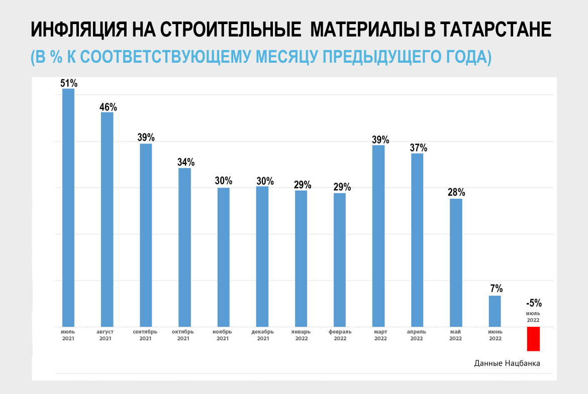 Разбег цены на стройматериалы начали осенью 2020 года, а пика достигли в июле прошлого года, тогда цены год к году выросли в 1,5 раза. В июле этого года цены на стройматериалы в Татарстане, согласно расчетам Росстата, снизились на 5%.