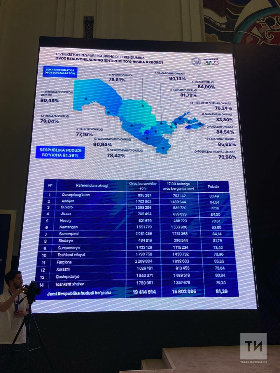 Явка избирателей на участки для голосования по обновленной Конституции составила 81,39% на 17.00 по местному времени (15.00 мск), сообщил на брифинге в пресс-центре Центральной избирательной комиссии Узбекистана зампредседателя ЦИК Бахром Кучкаров. Участие в волеизъявлении приняли свыше 15 млн граждан Узбекистана, имеющих право голоса. По данным ЦИК, наиболее высокая явка избирателей отмечена в Ферганской области, она составила 85,6%.