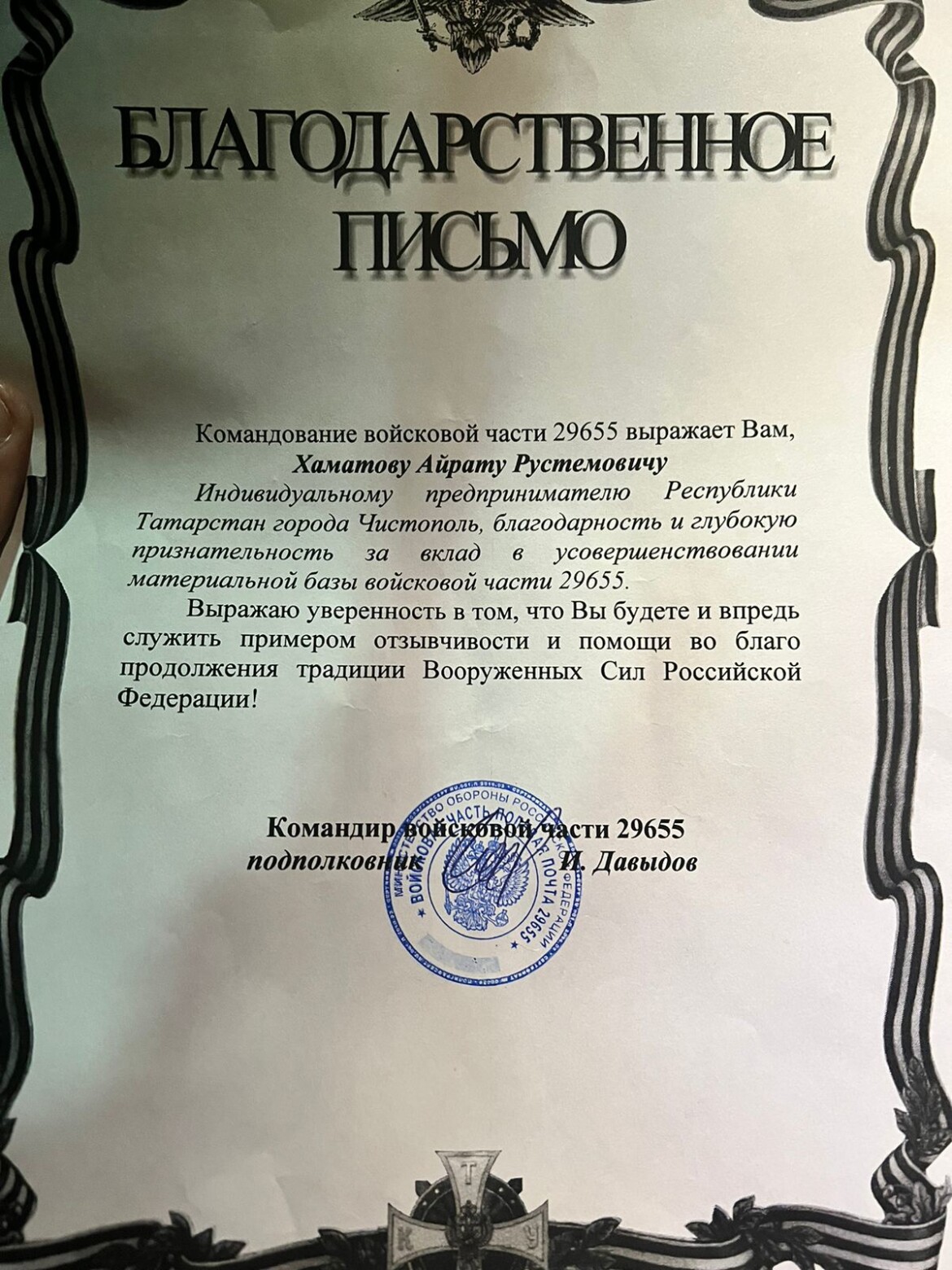 А подполковник Давыдов — командир войсковой части 29655 — выписал предпринимателю Айрату Хаматову, который участвовал в сборе медикаментов, благодарственное письмо за организацию шефской гуманитарной помощи для госпиталя.