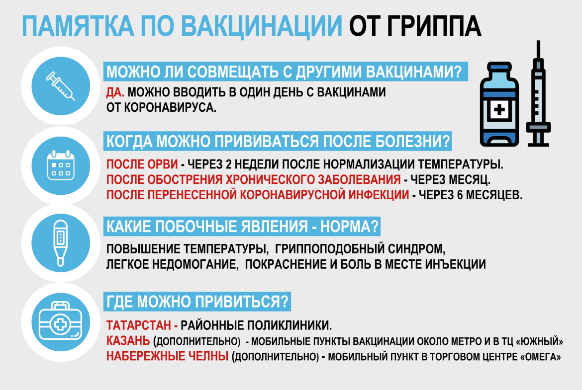 В Татарстане сделать прививку против гриппа можно в любой поликлинике. В Казани открыты мобильные пункты вакцинации около метро и в ТЦ «Южный». В Набережных Челнах в торговом центре «Омега».