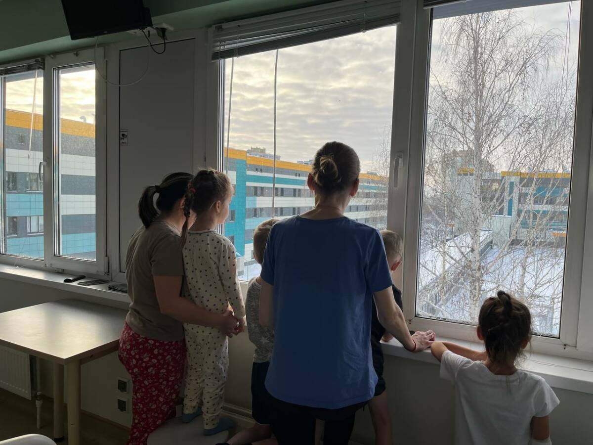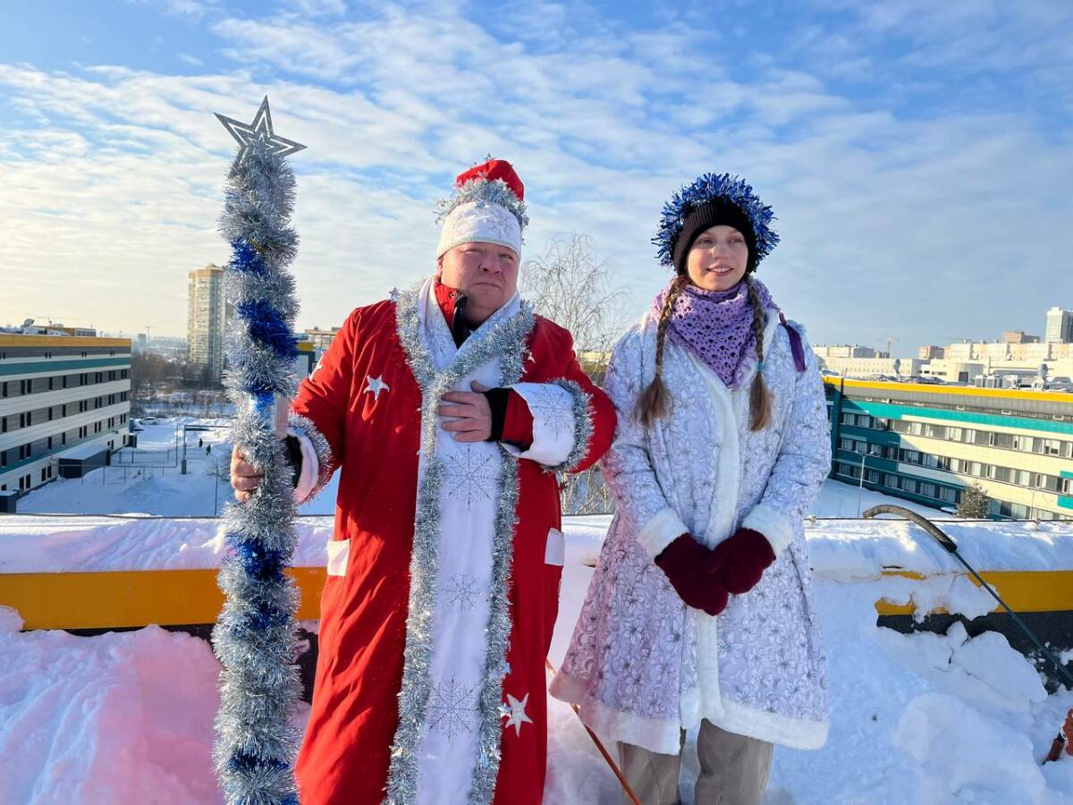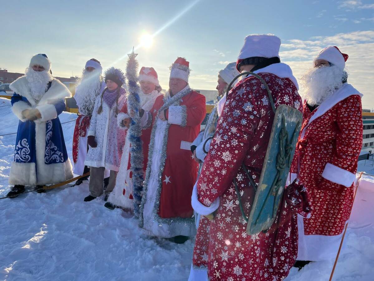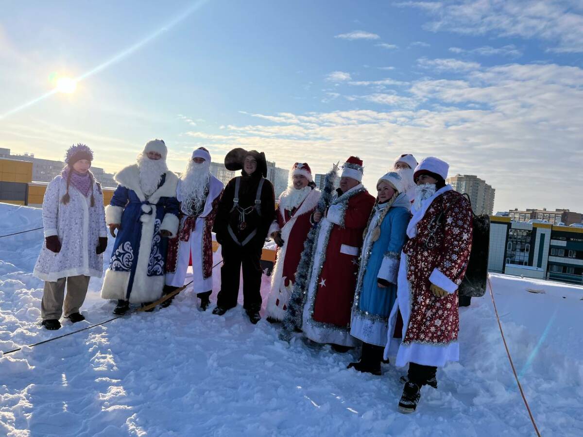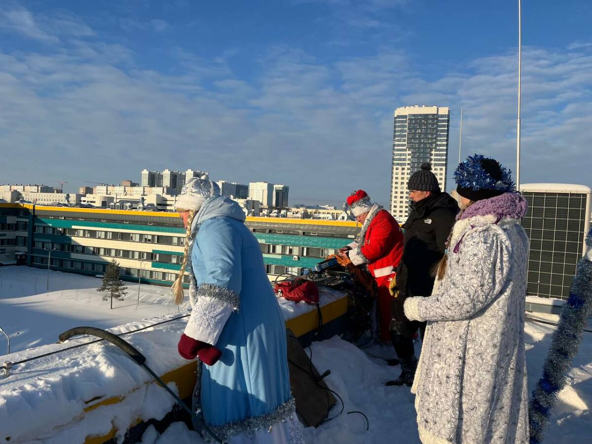 С крыши здания к палатам спустились сразу восемь сказочных персонажей: Деды Морозы, Снегурочки и даже Чебурашка. В костюмах, с плакатами и поздравлениями, при помощи альпинистского снаряжения они спускались к окнам палат, махали детям, стучали в стекла и дарили праздничное настроение тем, кто сейчас проходит лечение.