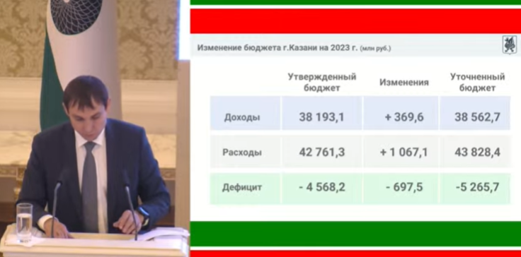 «В результате внесенных изменений, объем бюджета Казани на 2023 год по доходам составит 38,5 млрд рублей, расходам — 43,8 млрд рублей с дефицитом 5,2 млрд рублей, источником покрытия которого являются остатки средств бюджета города на начало года», — отметил спикер, выступая перед депутатами.