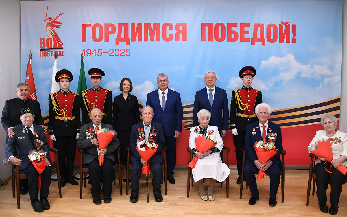 Минниханов поздравил ветеранов с юбилеем Великой Победы и отметил, что около 700 тысяч жителей республики были призваны на фронт, половина из них погибли или пропали без вести. Более 200 тысяч татарстанцев были награждены за храбрость и мужество, «Золотой Звездой» Героя Советского Союза отмечены 353 бойца, а 48 стали полными кавалерами ордена Славы.