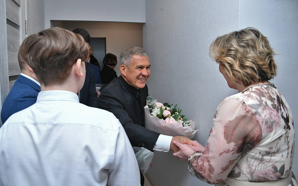 Рустам Минниханов в самом начале визита в Челны поучаствовал в заселении арендного дома, построенного для сотрудников КАМАЗа Госжилфондом при Раисе РТ.