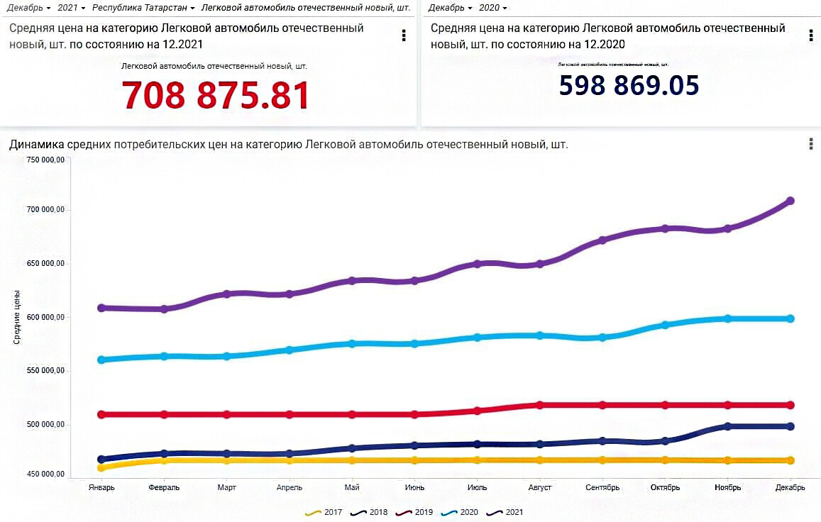 По данным Росстата, средний чек на новые отечественные автомобили в Татарстане за 2021 год вырос на 19% и достиг 710 тыс. рублей. Стоимость новых иномарок поднялась на 25% – до 1,3 млн рублей.