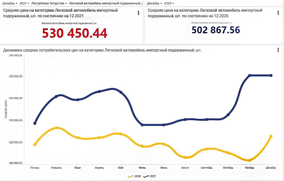 По информации Росстала, средняя цена иномарок на вторичном рынке за 2021 год увеличилась на 6% – до 530 тыс. рублей.