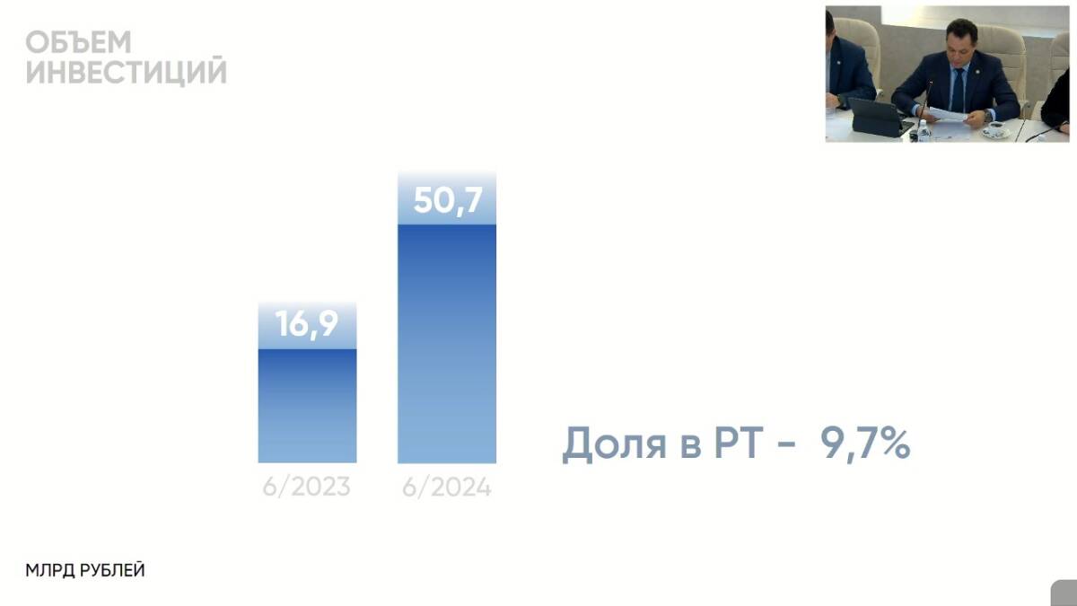 Лидирует Елабужский район и по объему инвестиций на душу населения, первенство он сохраняет с 2023 года. В среднем на человека приходится 592 тысячи рублей. Общий объем инвестиций Елабужского района по итогам первого полугодия 2024 года составил 50 миллиардов рублей. По итогам 2023 года – 163 млрд, 2022 года – 48 млрд.