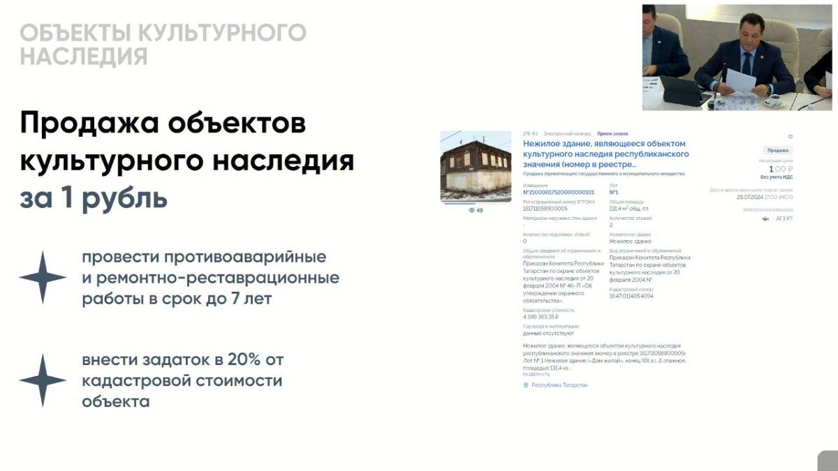 Также в Елабуге реализуют некоторые объекты культурного наследия за рубль. Уже проданы несколько зданий по ул. 10 лет Татарстана. В них появятся апартаменты для сдачи в аренду, офисы и кафе. В доме №45 по улице Казанской сделают музей искусства, а дом №47 на той же улице переоборудуют под гостиничный комплекс. У инвесторов уже есть интерес и к ряду других зданий. Кстати, все они расположены на одной территории, которая в дальнейшем станет историческим парком.