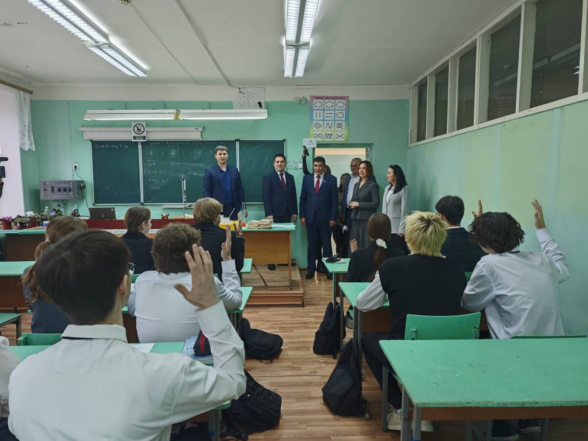 В Бугульме Руслан Гаджиев посетил школы №6 и лицей №2. Его сопровождали и.о. руководителя исполнительного комитета района Руслан Масалимов, заместитель руководителя исполнительного комитета и начальник управления образования Валентина Кульбеда, исполнительный секретарь местного отделения партии Анвар Ахмадиев.