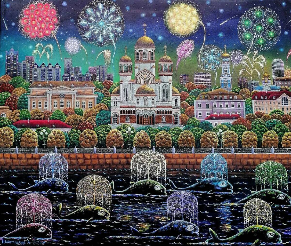 Заглавной работой выставки стала картина самого, пожалуй, известного художника-наивиста Татарстана Альфрида Шаймарданова. Его полотно «Приплыли. Екатеринбург» 2024 года, как сообщила «Татар-информу» куратор, буквально повсюду – на баннерах, мерче. Более того, картина стала символом и афишей целого фестиваля, который проводит Екатеринбургский музей изобразительных искусств, имеющий отдельное подразделение Музей наива.