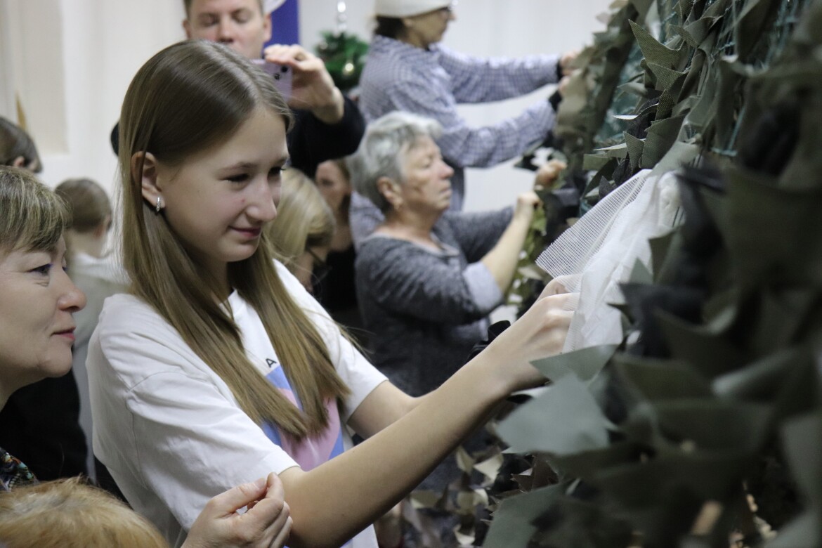 Помимо сбора гумпомощи, в этом пункте плетут маскировочные сети для бойцов.