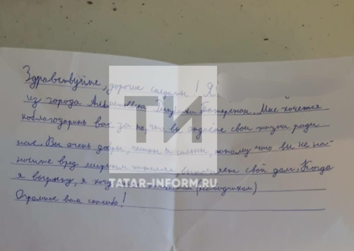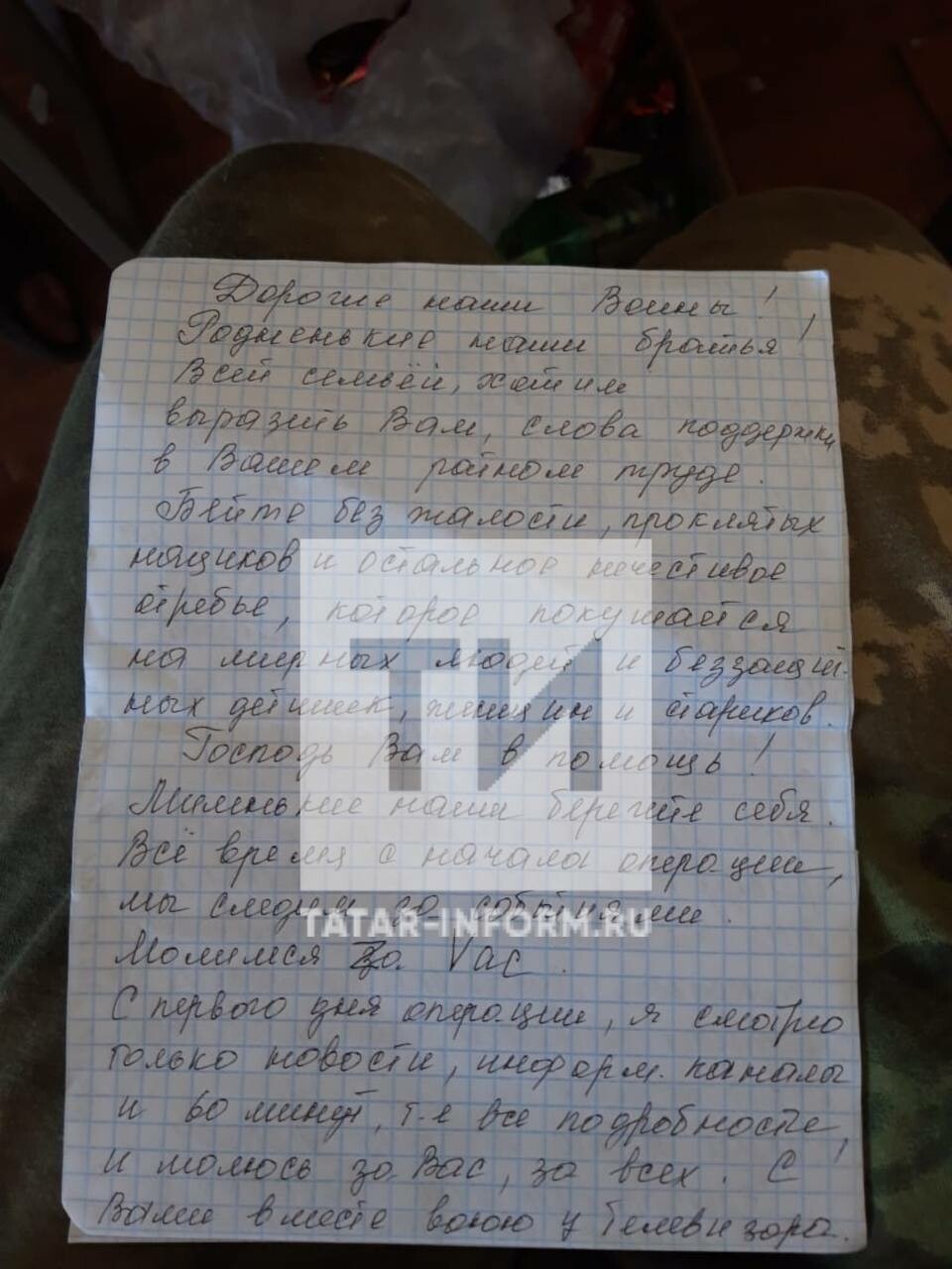 Еще одно письмо бойцам батальонов написала одна из семей из Татарстана. Автор письма пожелал военнослужащим беречь себя, и написал им слова поддержки.