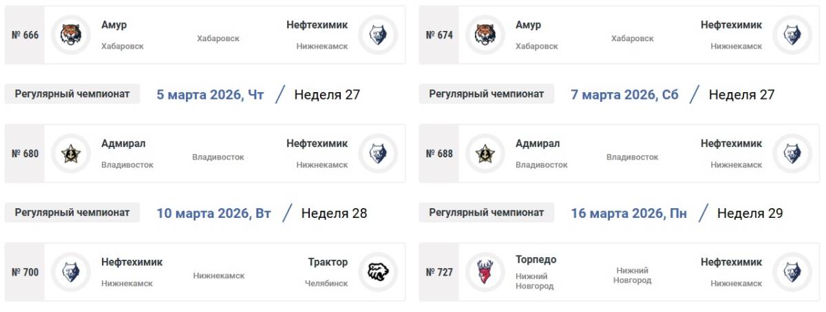 Сверхсложным для команды Игоря Гришина будет завершающий отрезок в марте. Татарстанская команда сыграет сразу 8 игр из девяти в гостях. Причем начинаться март будет сложнейшим четырехматчевым выездом на на Дальний Восток. Впрочем, «Нефтехимику» не привыкать проводить игры на Дальнем Востоке на финише чемпионата. Только за последние пять сезоном нижнекамцы трижды играли в Хабаровске и Владивостоке в последний месяц регулярки.
