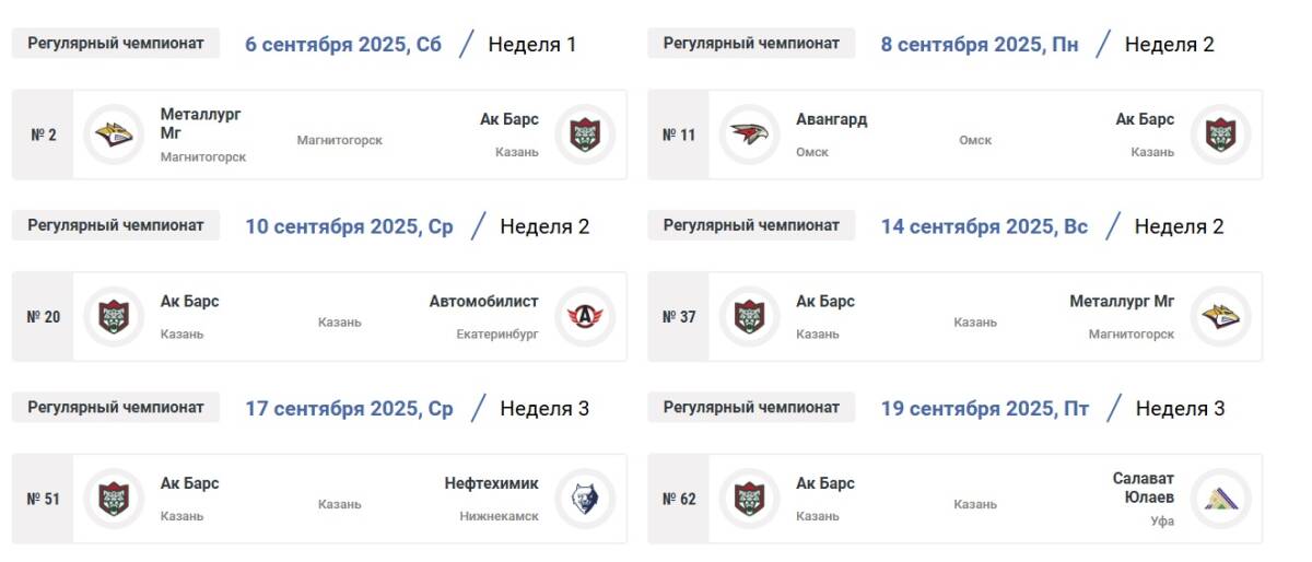 «Ак Барсу» предстоит серьезный стресс-тест уже с самого начала. Уже в сентябре команде Анвара Гатиятулина предстоит дважды сразиться с магнитогорским «Металлургом» - в стартовой игре на выезде, 6 сентября. А также дома 14 сентября. Между этими играми казанцев проэкзаменует «Авангард» на своем льду (8 сентября) и екатеринбургский «Автомобилист» в первой казанской игре сезона (10 сентября). А после домашнего матча с «Нефтехимиком», казанцы примут «Салават Юлаев» в первом дерби сезона.