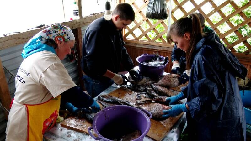 На время волонтеры перебрались из помещения штаба в частный дом: там удобнее обрабатывать рыбу. Работа непростая – нужно снять чешую, разделать тушку, подготовить филе. После подготовки рыба отправляется в автоклав, где готовится около трех часов. За один раз туда помещается 16 банок.