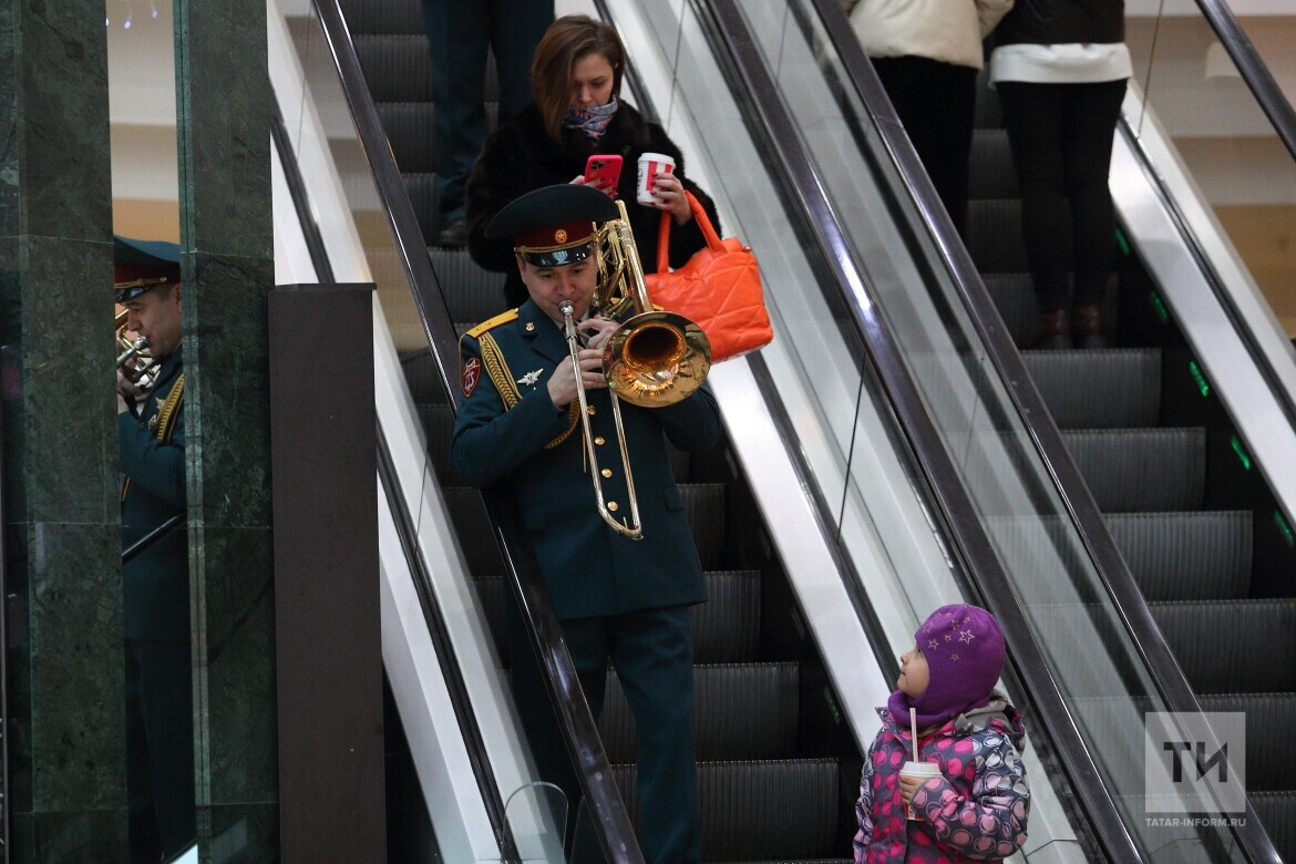 Военный оркестр Росгвардии провел праздничный флэшмоб к Дню защитника Отечества в одном их торговых центров Казани