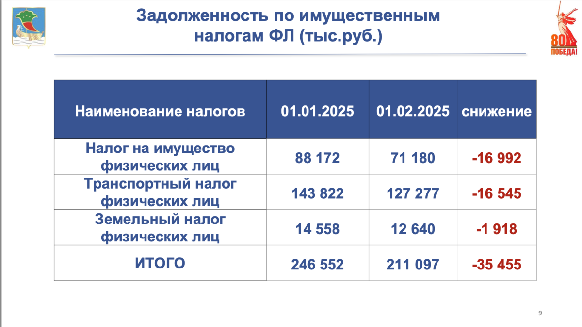 Дополнительно проведено 39 заседаний комиссий по взысканию задолженности, охвативших долги на сумму 5,54 млрд рублей. В результате работы налогоплательщики погасили 2,83 млрд рублей. В целом задолженность по имущественным налогам сократилась на 8,7% (23 млн рублей), однако ее общий объем остается значительным – 246 млн рублей.