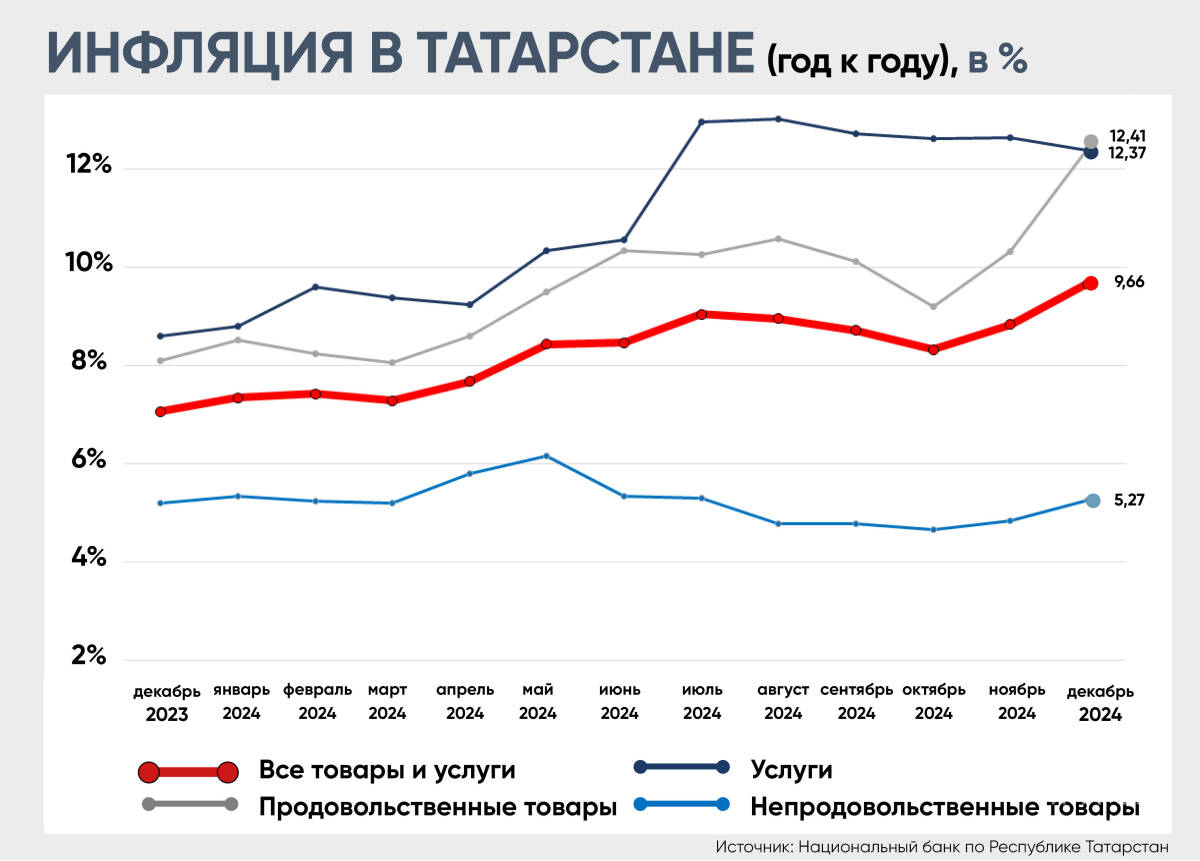 Показатель годовой инфляции в Татарстане в декабре 2024-го лишь немного недотянул до двузначного значения, остановившись на уровне в 9,66%. Выше в последний раз было только в феврале 2023-го (10,74%).