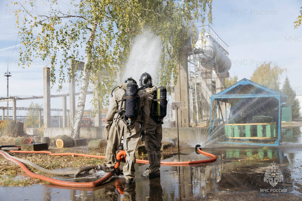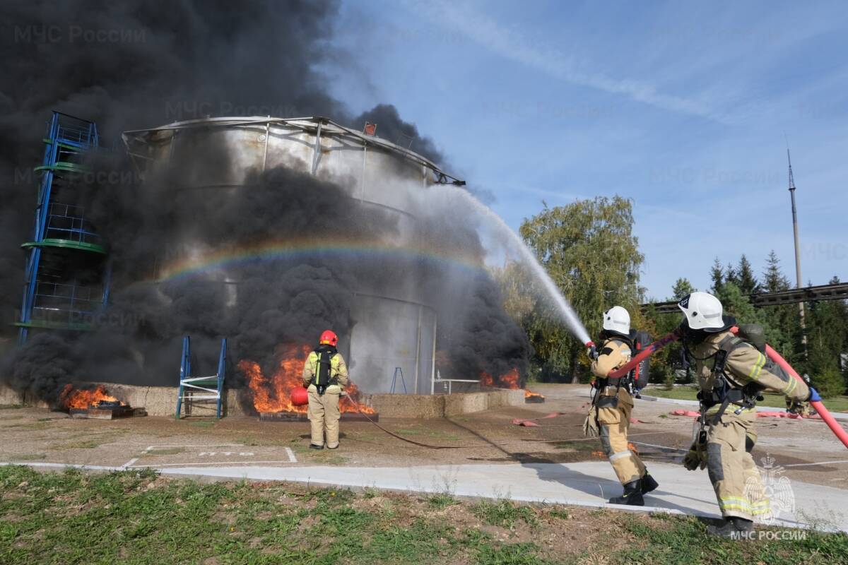 Согласно легенде учений, вначале произошло возгорание на резервуаре, после чего из другой поврежденной емкости в окружающую среду выбросилось значительное количество ядовитого продукта, представляющего угрозу для жизни. Прибыв на место происшествия, пожарные приступили к ликвидации огня, установили водяную завесу для снижения концентрации газа и использовали «подушку» воздушно-механической пены для нейтрализации разлива. Все действия осуществлялись с применением индивидуальных средств защиты дыхательных путей и в специальных защитных костюмах.