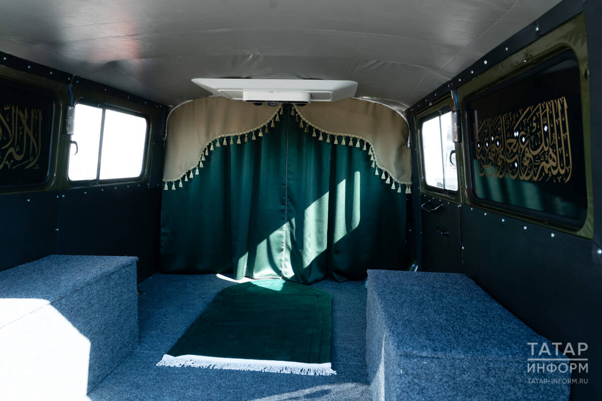 «На полу, стенах и потолках салонов сделали гидроизоляцию, шумоизоляцию и теплоизоляцию, полы выровнены и застелены ковролином, салоны обшиты материалом «искож», чтобы было удобно мыть. Украсили михрабами и шамаилями, установили ящики для сидения и хранения религиозной атрибутики, зафиксировали книжные полки. Установили кондиционеры и, конечно, средства РЭБ», – рассказал муфтий Татарстана Камиль Самигуллин «Татар-информу» о «начинке» мобильных мечетей в проекте «12 этаж».