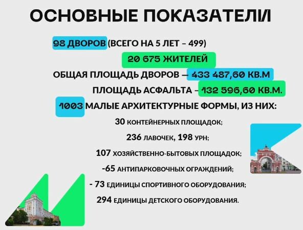 По словам Хисматуллина, в районах за три года реализации программы было благоустроено 319 дворов из 499, что составляет 64%. Общая площадь дворов — 433,5 тыс. кв. метров, площадь асфальта — 132 тыс. кв. метров.