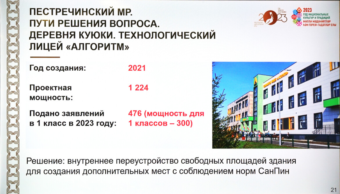 «В Лаишевском районе две проблемные школы – многопрофильный лицей “Здоровое поколение” в селе Усады и Столбищенская школа имени А.П. Малышева. Проектная мощность почти в два раза переполнена. Все заявления рассмотрены. Практически все дети распределены по школам», – отметила замруководителя департамента.
