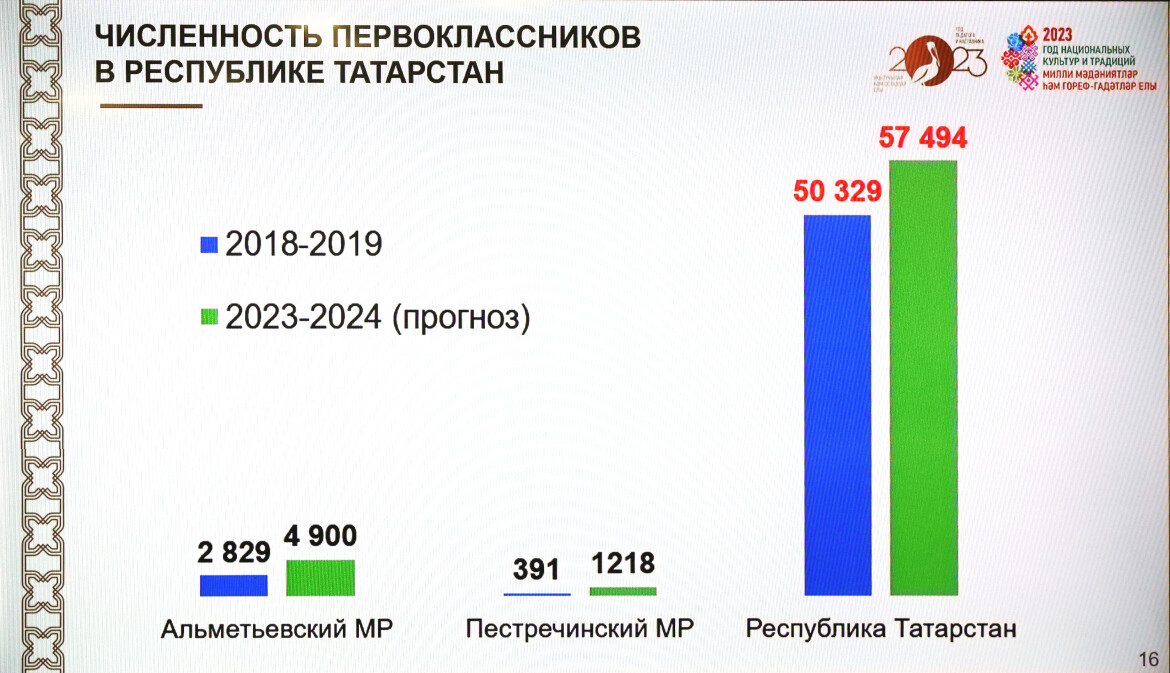 «За пять лет, с 2019 по 2023 год, количество первоклассников в Татарстане увеличилось на 7 тыс. человек. Но эти дети распространены по республике неравномерно. То есть где-то количество первоклассников не очень сильно увеличилось. А в двух районах выросло серьезно. Когда мы наблюдаем за процессом определения первоклассников в образовательные организации, видим две зоны, которые вызывают у нас некоторую тревогу, – это Пестречинский и Альметьевский районы», – добавила она.