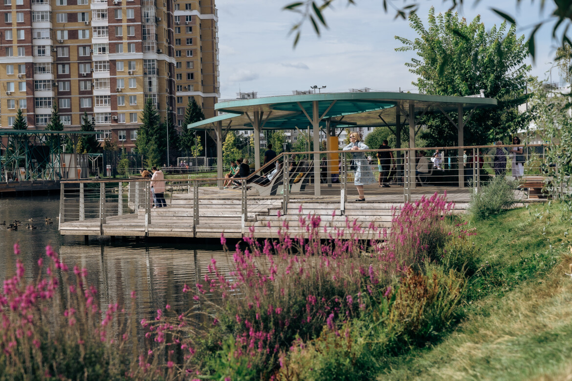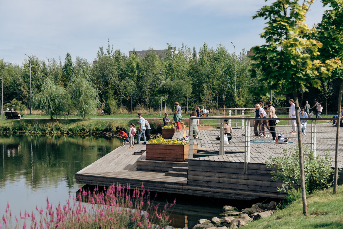 При строительстве парка специалисты организовали транзитные направления, которые помогают людям не обходить весь квартал по периметру, а пересекать его вдоль парковой зоны, сокращая время на дорогу.