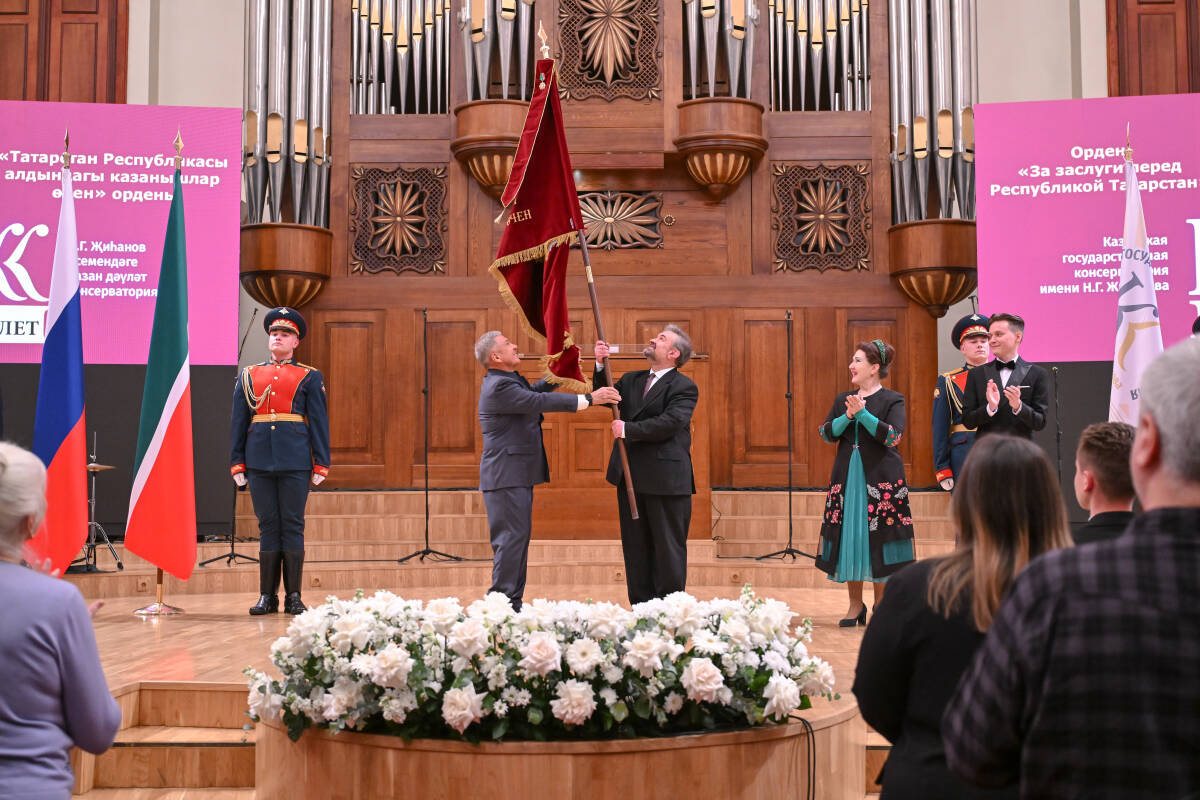 В понедельник Рустам Минниханов вручил орден «За заслуги перед Республикой Татарстан» коллективу Казанской государственной консерватории имени Н. Г. Жиганова. Торжественная церемония прошла во время празднования 80-летнего юбилея вуза в ГБКЗ им. С. Сайдашева в Казани.