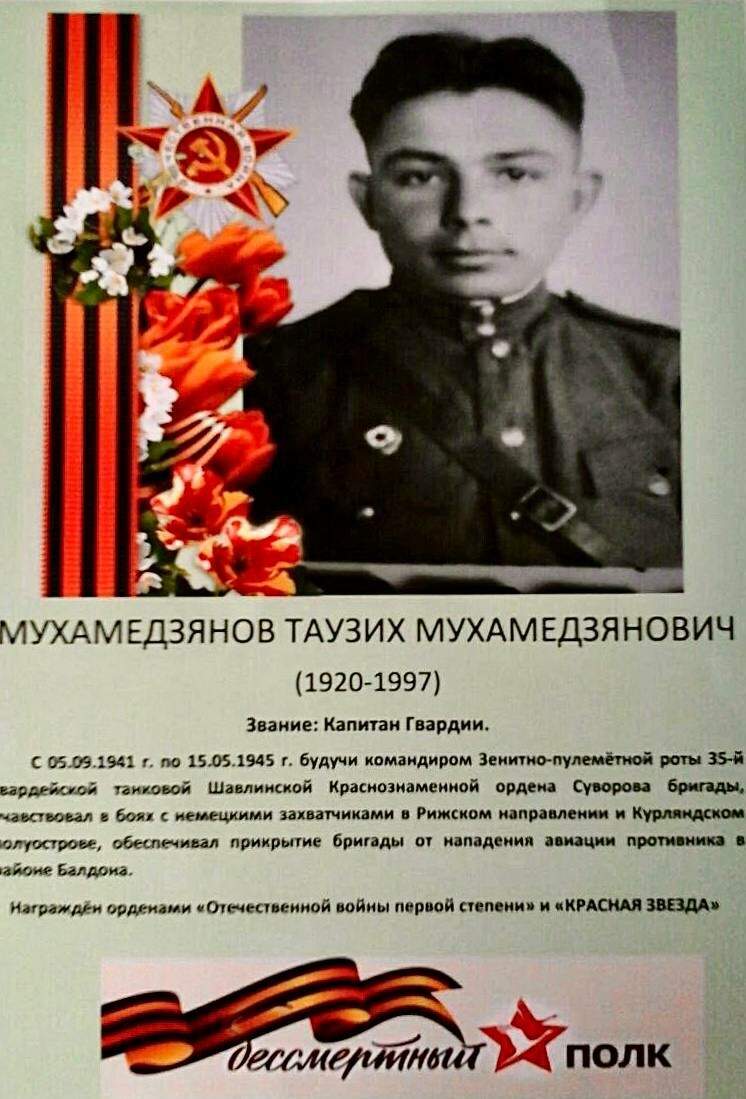 По словам рассказчицы, капитан гвардии Таузих Мухамедзянович Мухамедзянов родился в деревне Кушулево Дюртюлинского района Башкирской АССР 28 ноября 1920 года.