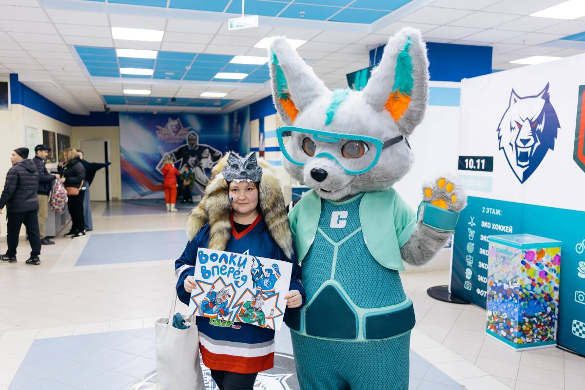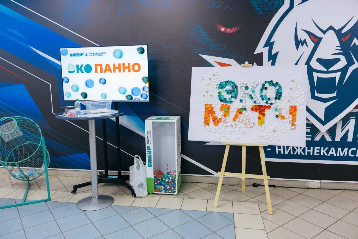 В холле Ледового дворца гостей матча встречали ведущий, маскот СИБУРа Каталик и волонтеры проекта «Экотурнир с пользой». Три года назад инженер по автоматизации ремонтно-механического завода Ренат Нигматуллин запустил этот проект при поддержке программы социальных инвестиций «Формула хороших дел» СИБУРа. Волонтеры установили в нижнекамских школах специальные кубы, чтобы ученики могли приносить использованный пластик на переработку.