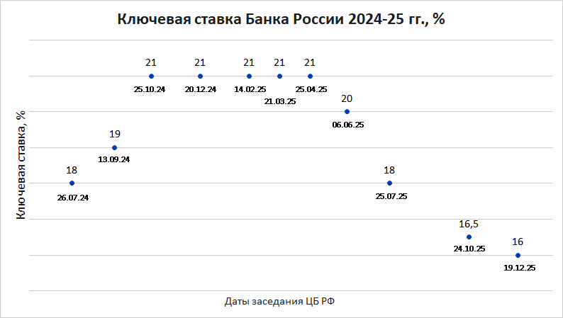 В 2025 году ключевая ставка в России снизилась с рекордно высокого уровня в 21% до 16% к середине декабря. Заключительное в прошлом году решение по ключевой ставке по стечению обстоятельств состоялось в день итоговой пресс-конференции Путина.