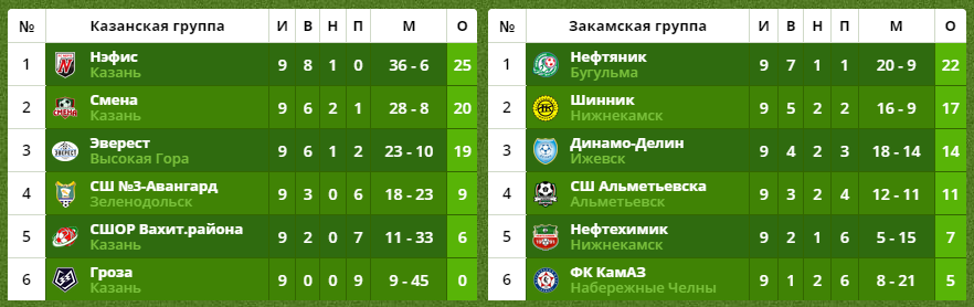 В закамской зоне чемпионата Татарстана лидерство удерживает «Нефтяник» из Бугульмы, который сыграл вничью с «КАМАЗом» (2:2). На втором месте расположился «Шинник» из Нижнекамска, который в Ижевске поделил очки с ФК «Динамо-Делин» (1:1). Клуб из Удмуртии – на 3-м месте.