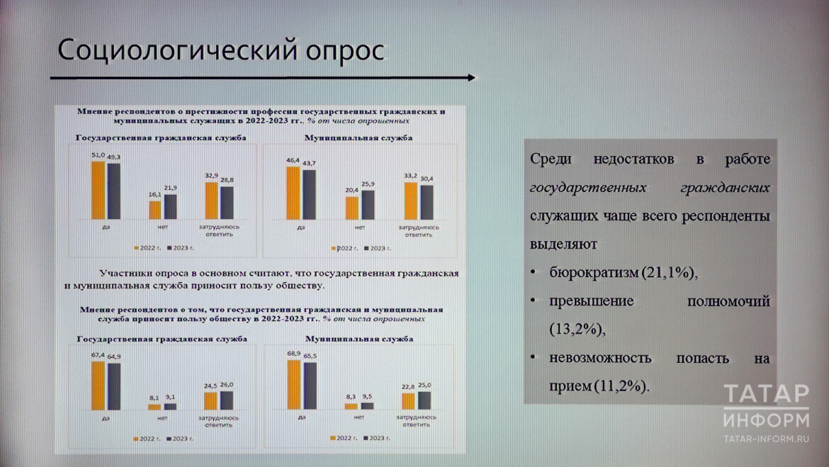 «По итогам прошлого года 51% из опрошенных респондентов считают, что государственная гражданская и муниципальная служба приносит пользу обществу. 16% с этим не согласны, еще 32% затруднились ответить. Среди недостатков в работе государственных гражданских служащих чаще всего респонденты выделяют бюрократизм – это 21% ответов, превышение полномочий – так считают 13%, и 11% опрошенных говорят, что это невозможность попасть на прием», – рассказала Равия Шрша.
