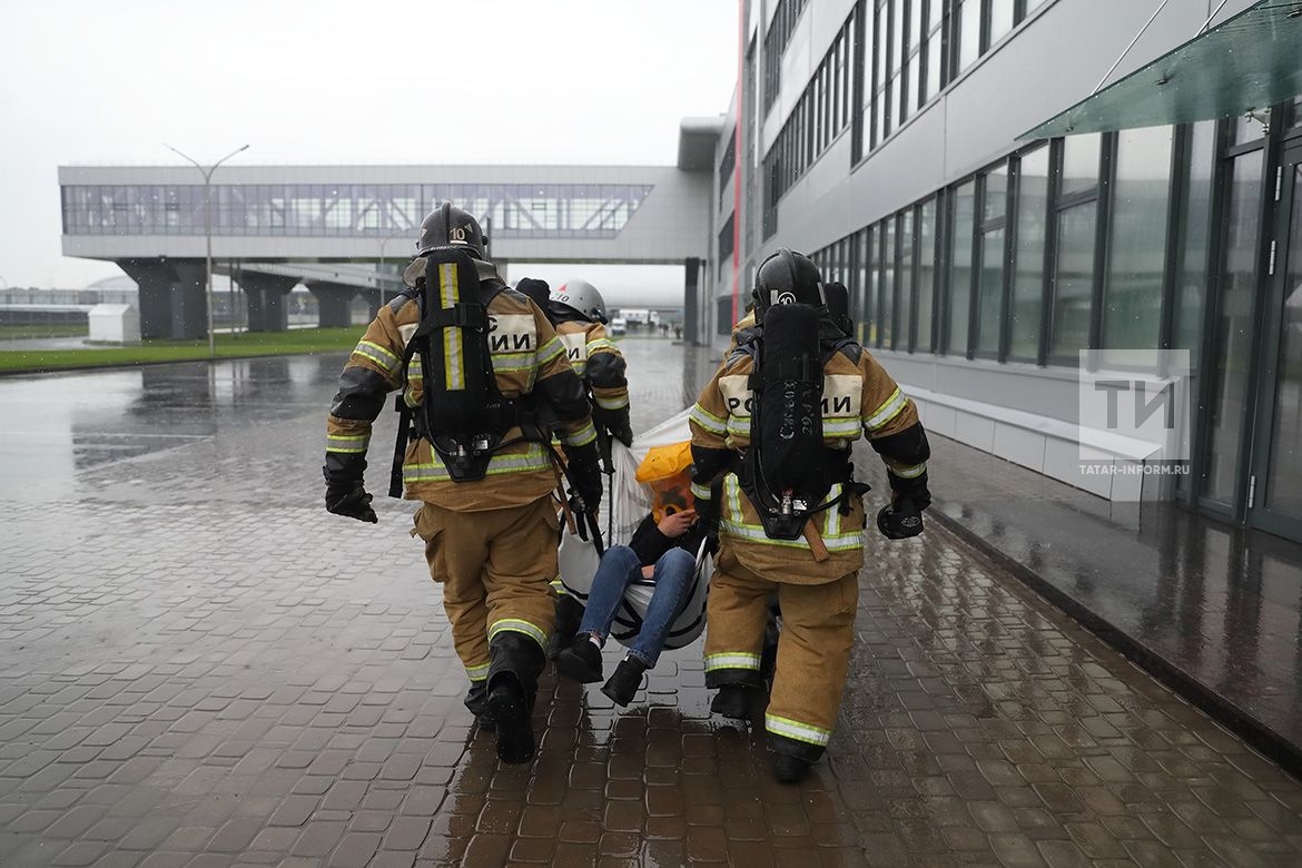 Чтобы потушить условное возгорание, сотрудники МЧС протянули к концертному залу пожарный рукав. Одновременно пожарные помогали потерявшимся в дыму посетителям выбраться из горящего помещения, а потерявших сознание выносили на носилках. Все это время у здания «Казань Экспо» дежурили бригады скорой помощи, которые принимали пострадавших.