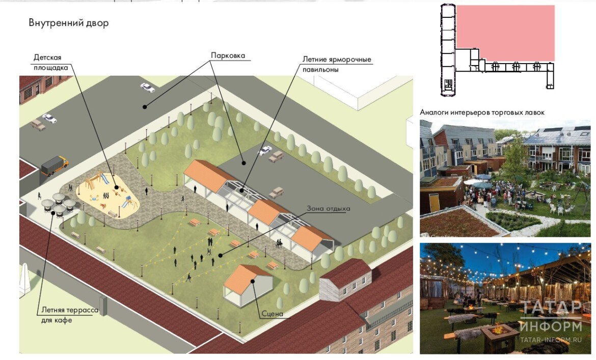 Территорию объекта культурного наследия планируется благоустроить в купеческом стиле конца XIX – начала ХХ века. На территории мощеного двора под открытым небом могли бы проводиться мероприятия, а также организованы парковочные места.