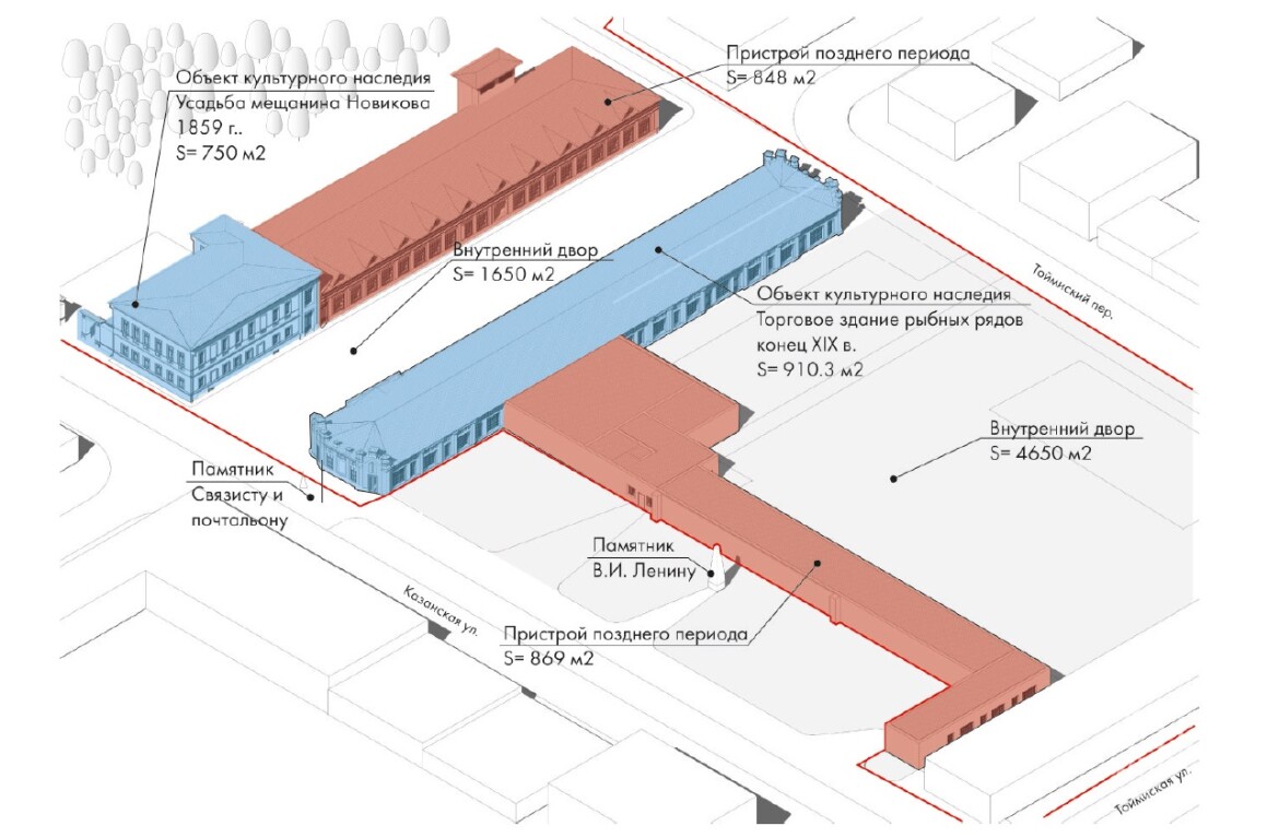 Предложение по актуальному приспособлению объекта культурного наследия конца XIX века: рыбные ряды (Казанская, 47) и главный дом усадьбы Новикова.