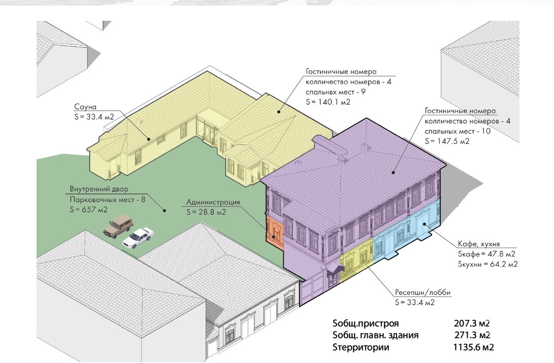 Под современные нужды, а именно под небольшой бутик-отель, концепция предлагает приспособить главный дом усадьбы конца XIX века, объект культурного наследия регионального значения. На первом этаже могло бы расположиться кафе с баром и кухней, административная часть, ресепшн, на втором – жилых 4 номера. В других воссоздаваемых постройках предлагается сохранить стилистику хозяйственных деревянных строений, здесь также можно обустроить еще 4 гостиничных номера, а также банный комплекс и складские помещения.
