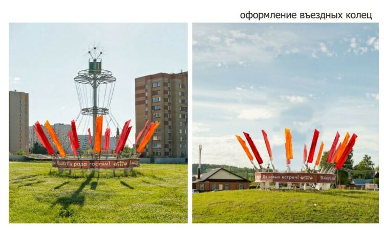 Два крупномасштабных баннера появятся на фасадах жилых домов № 19 по проспекту Нефтяников и доме № 1 по улице Интернациональная. Въездные кольца украсят флагами бордового, красного и оранжевого цветов.
