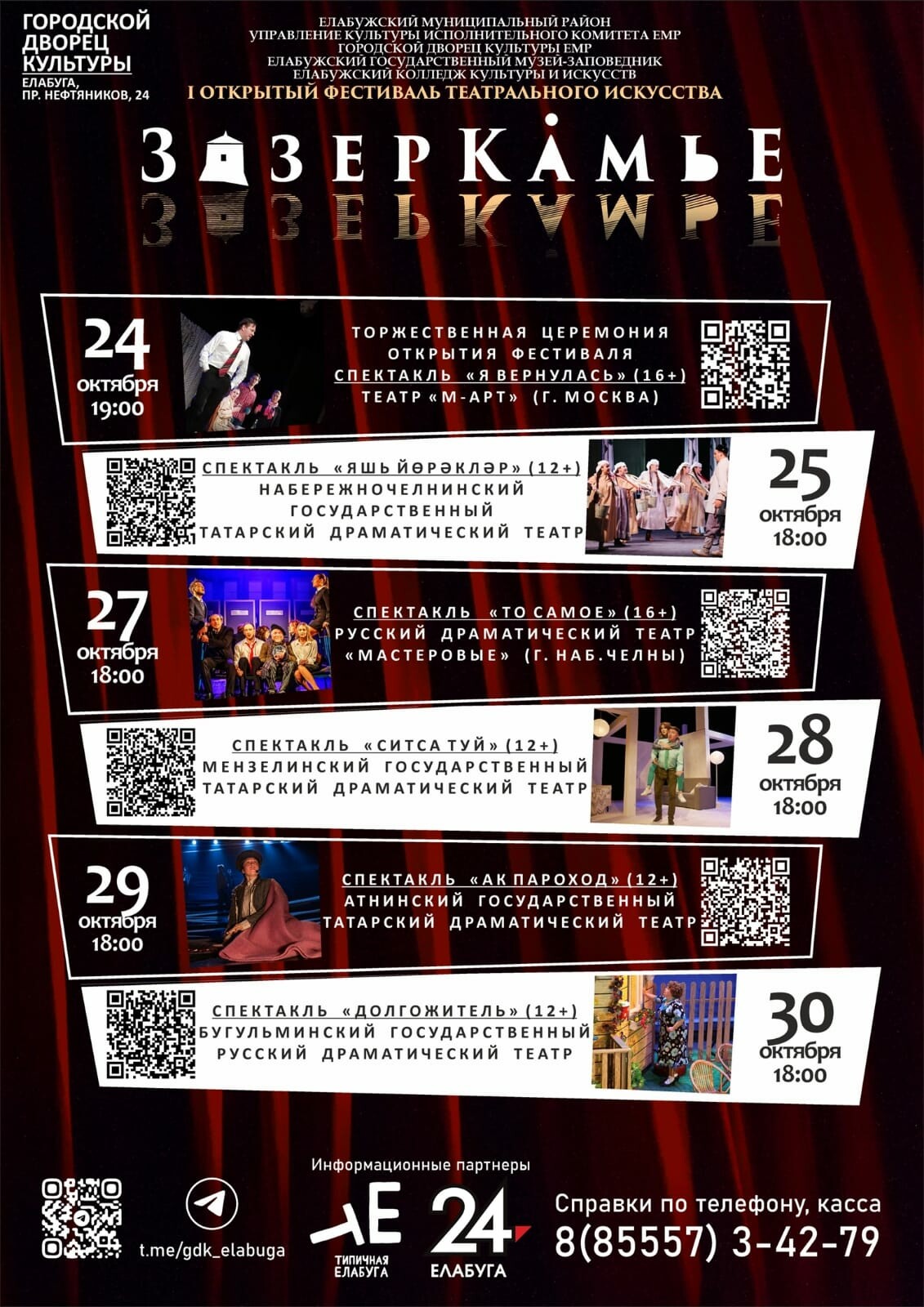 На следующий день, 25 октября, зрители увидят спектакль «Яшь йорэклэр» от артистов татарского драмтеатра Челнов, 27 октября — «То самое» от челнинских «Мастеровых». 28 октября Мензелинский театр покажет спектакль «Ситса туй» («Ситцевая свадьба») Ильгиза Зайниева, 29 октября артисты Атнинского драмтеатра представят «Ак пароход». Завершатся показы спектаклем Бугульминского драмтеатра «Долгожитель».