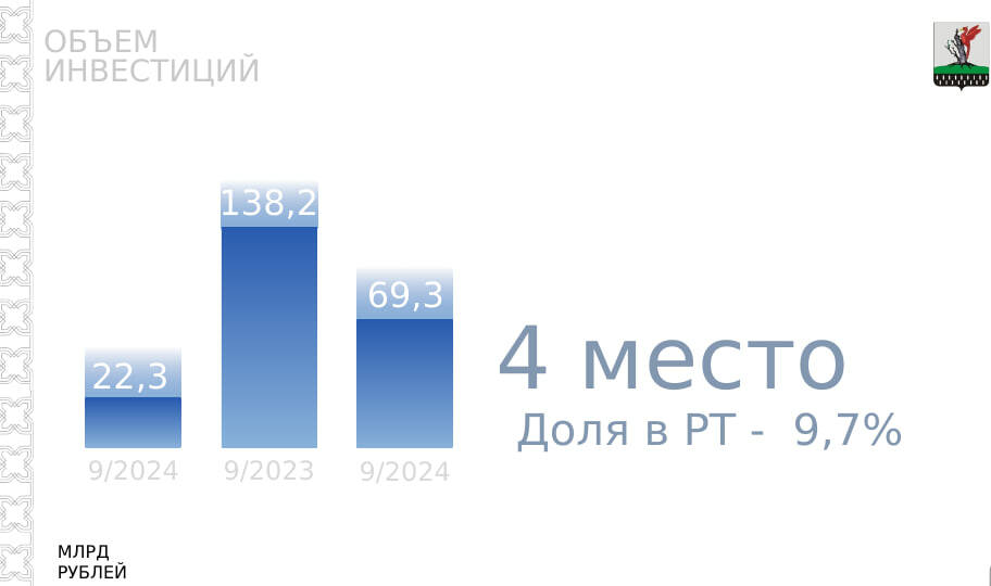 За 9 месяцев прошлого года объем инвестиций предприятий района составил 69,3 млрд рублей, что позволило Елабуге занять 4-е место в Татарстане.