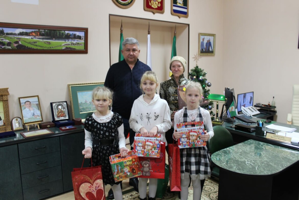 Девятилетняя София, восьмилетние Лаура и Лейла Пономаревы мечтали о наборах детской косметики. Однако глава района не только вручил им желаемое, но и дополнил наборы сладкими подарками. Бабушке трех сестер Мадине Газизовне подарили продуктовые наборы.