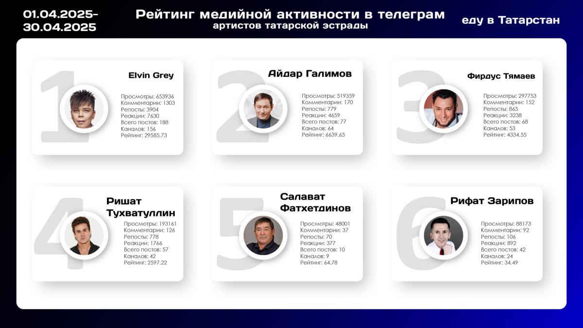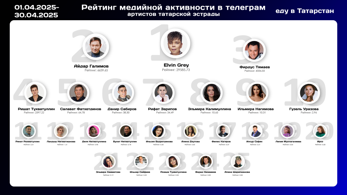 Telegram-канал «Еду в Татарстан | Статистика» представил апрельский рейтинг медиаактивности звезд татарской эстрады.