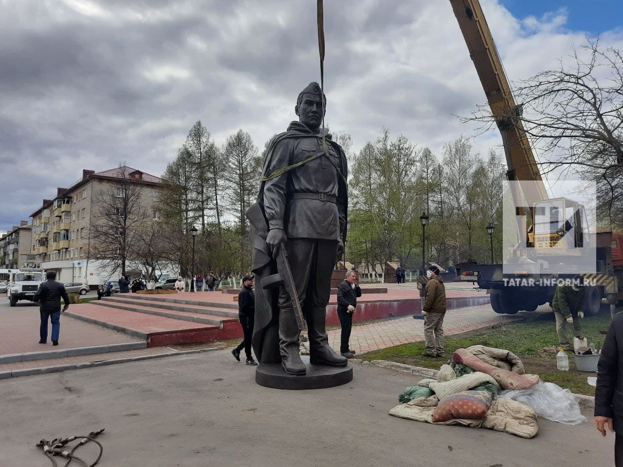 Сегодня в Заинске на площади Победы завершилась установка нового памятника Воину-освободителю взамен сгоревшего. Новый монумент доставили из Казани и установили на постамент на Бульваре Победы.