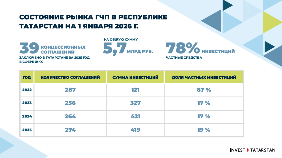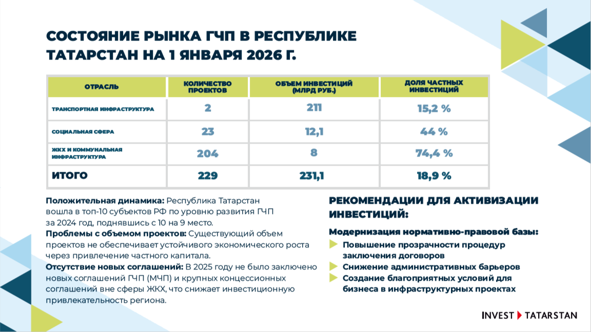 По состоянию на 1 января 2026 года в Татарстане реализуется 229 проектов в формате ГЧП с общим объемом инвестиций 231 млрд рублей.