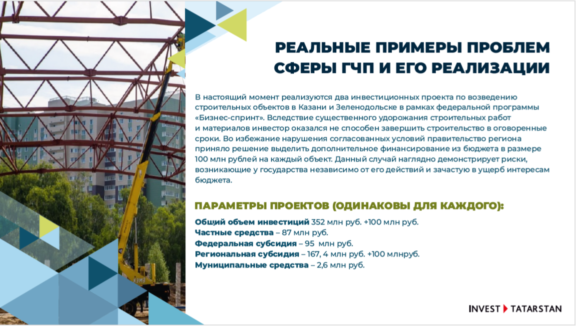 Есть и реальный пример. По федеральной программе «Бизнес-спринт» через ГЧП в Казани и Зеленодольске строятся спортивные объекты для населения. Пока устанавливались договоренности, произошло существенное удорожание строительных работ и материалов, а инвестор оказался не способен завершить строительство в оговоренные сроки.